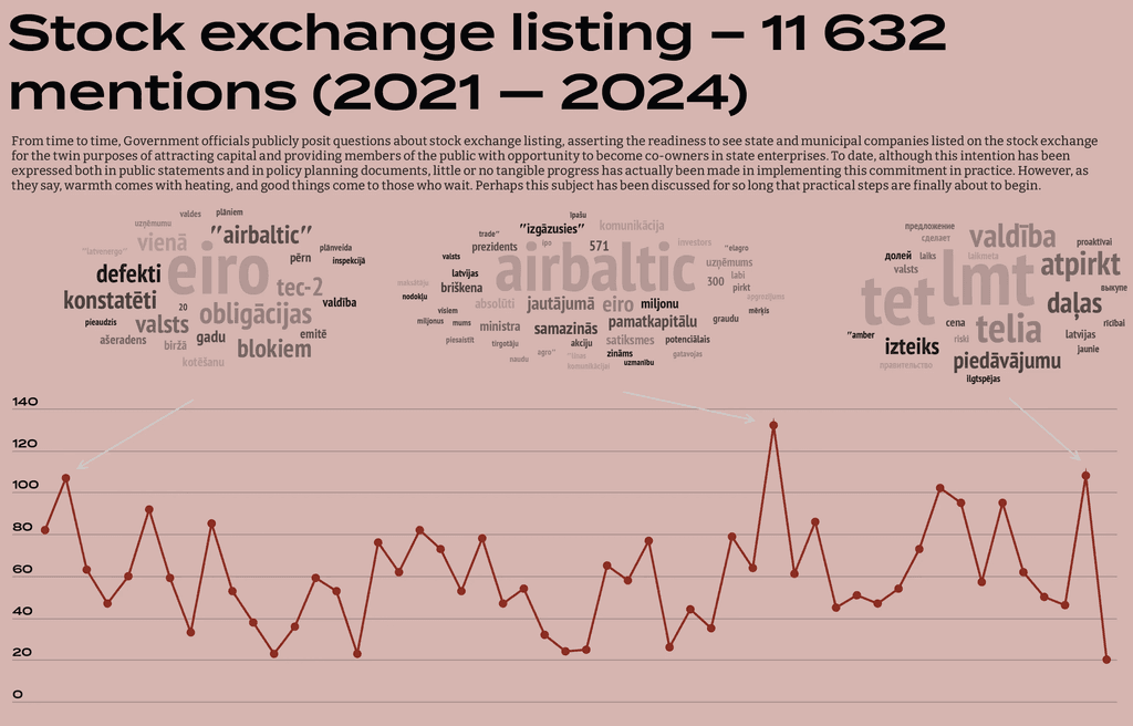 In the context of stock exchange listing, several thematic blocks can be highlighted including the placement of various types of securities on stock exchanges, discussions about the airBaltic IPO, as well as the listing of TET and LMT, especially in connection with the state's negotiations with the co-owner Telia.