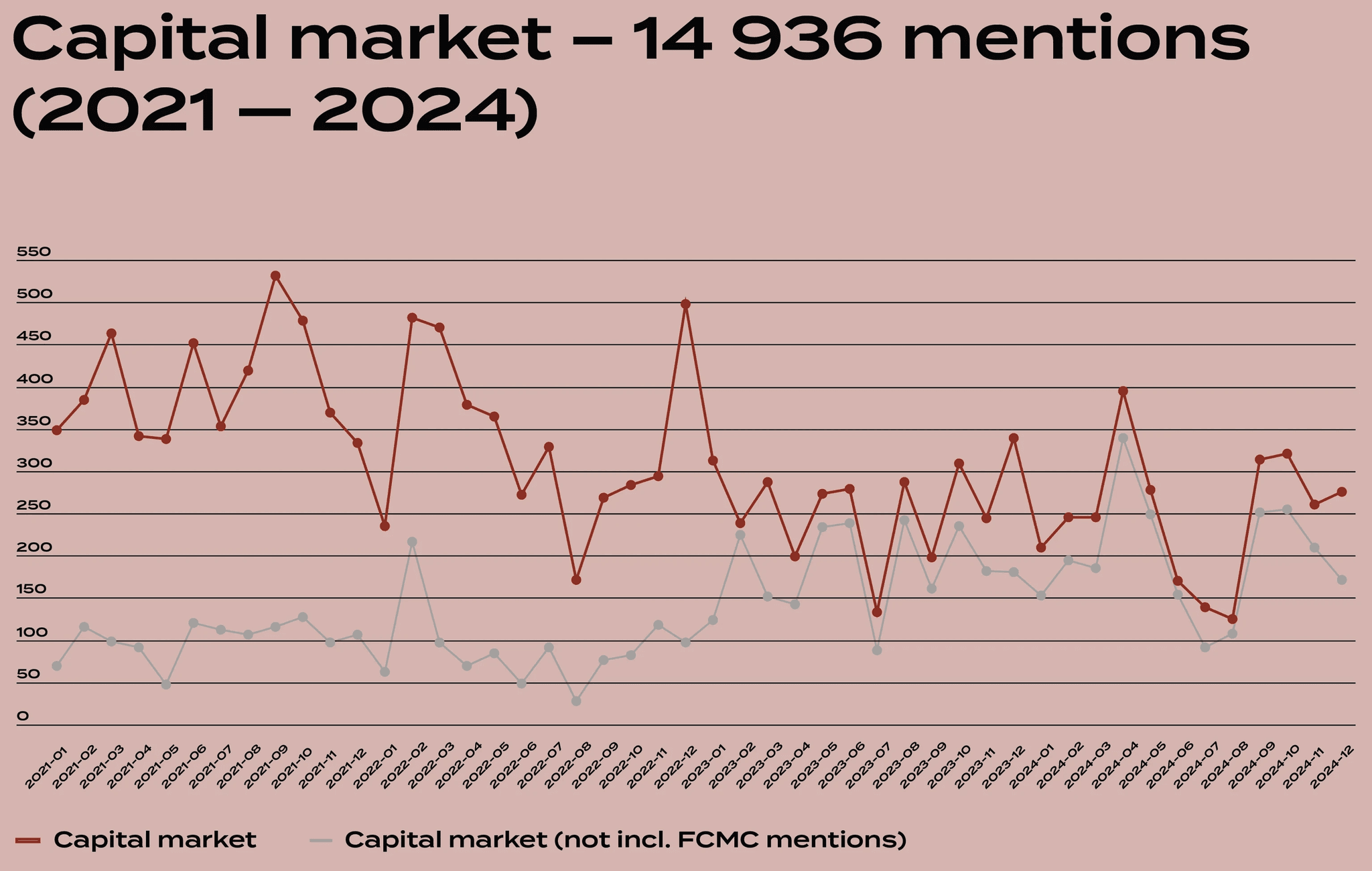 From 2021 to 2024, the capital market was mentioned in 14,934 media materials, of which 2,978 appeared in 2024. Although there is a slight nominal decrease, structural changes must be factored in – since 2023, the Financial and Capital Market Commission (FKTK) has been integrated into the structure of the Bank of Latvia, thus affecting the classification of media mentions.
