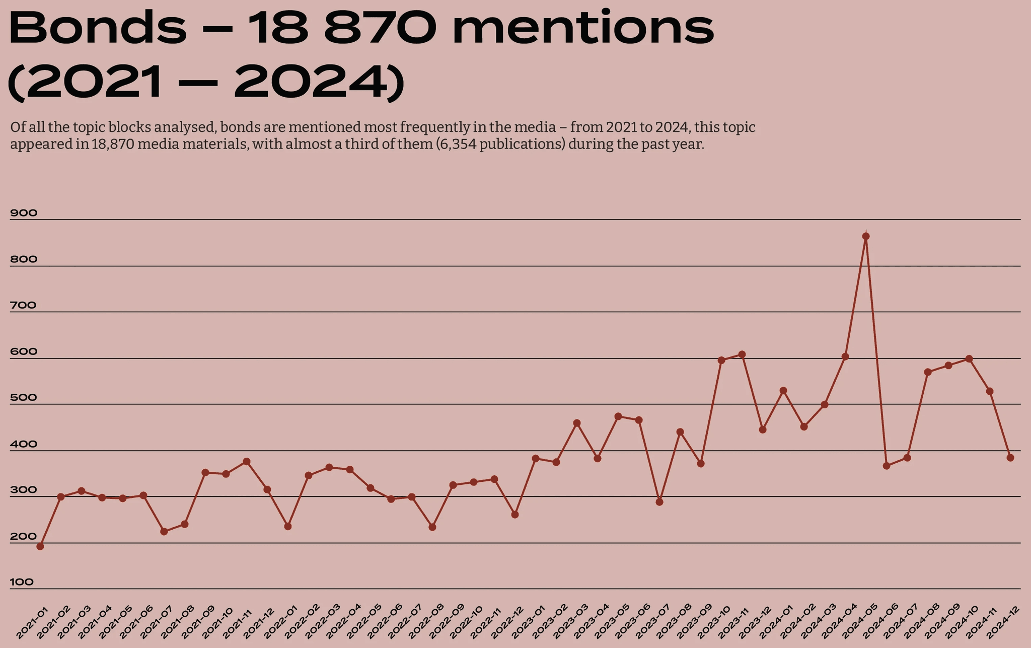 Of all the topic blocks analysed, bonds are mentioned most frequently in the media – from 2021 to 2024, this topic appeared in 18,870 media materials, with almost a third of them (6,354 publications) during the past year.