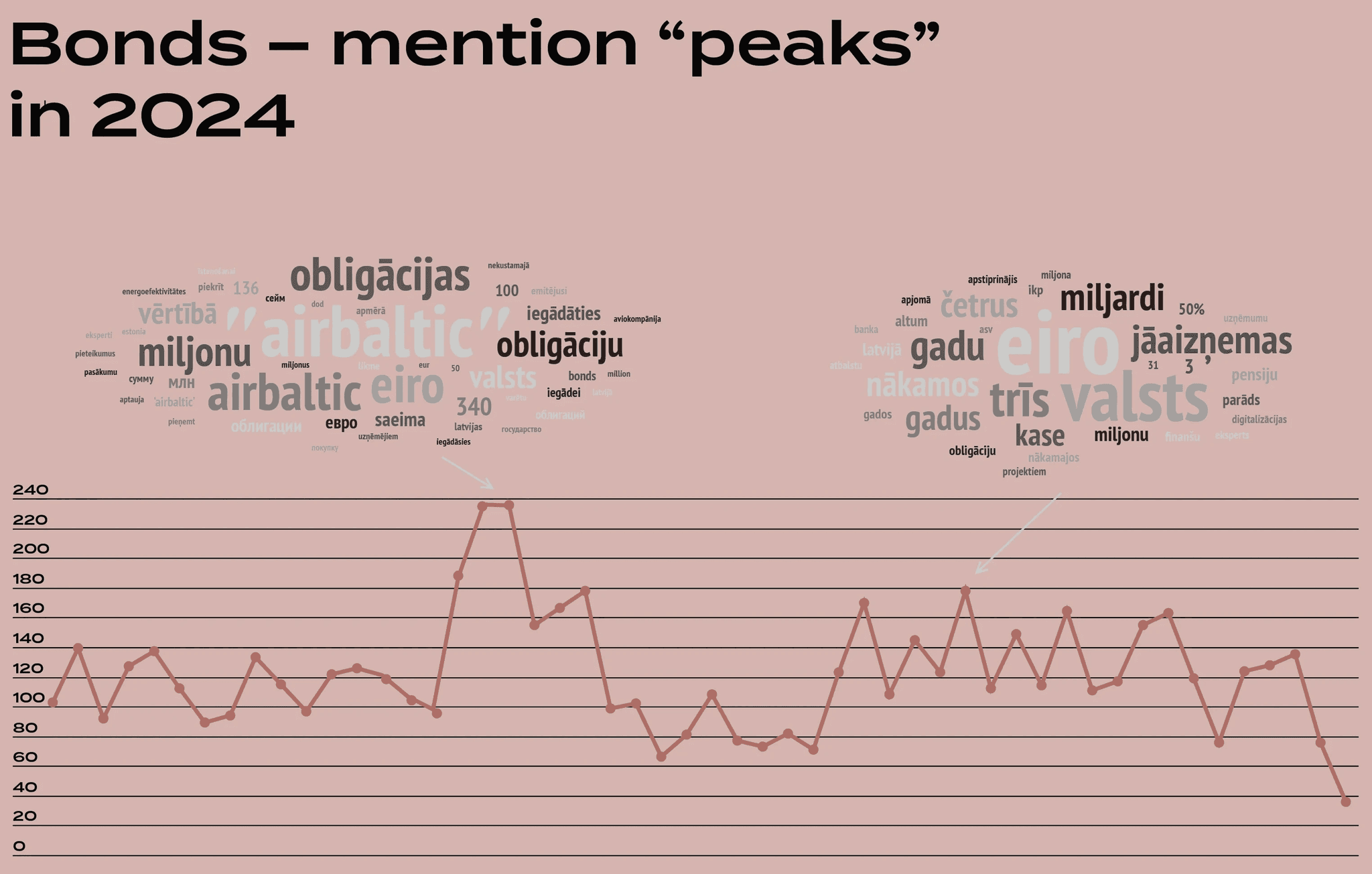 The most frequent mentions concern the issuance of government bonds, especially at the start of 2024 and subsequently during the autumn, as well as the widely discussed debates in the public space about the national airline airBaltic's bond issue in May 2024.