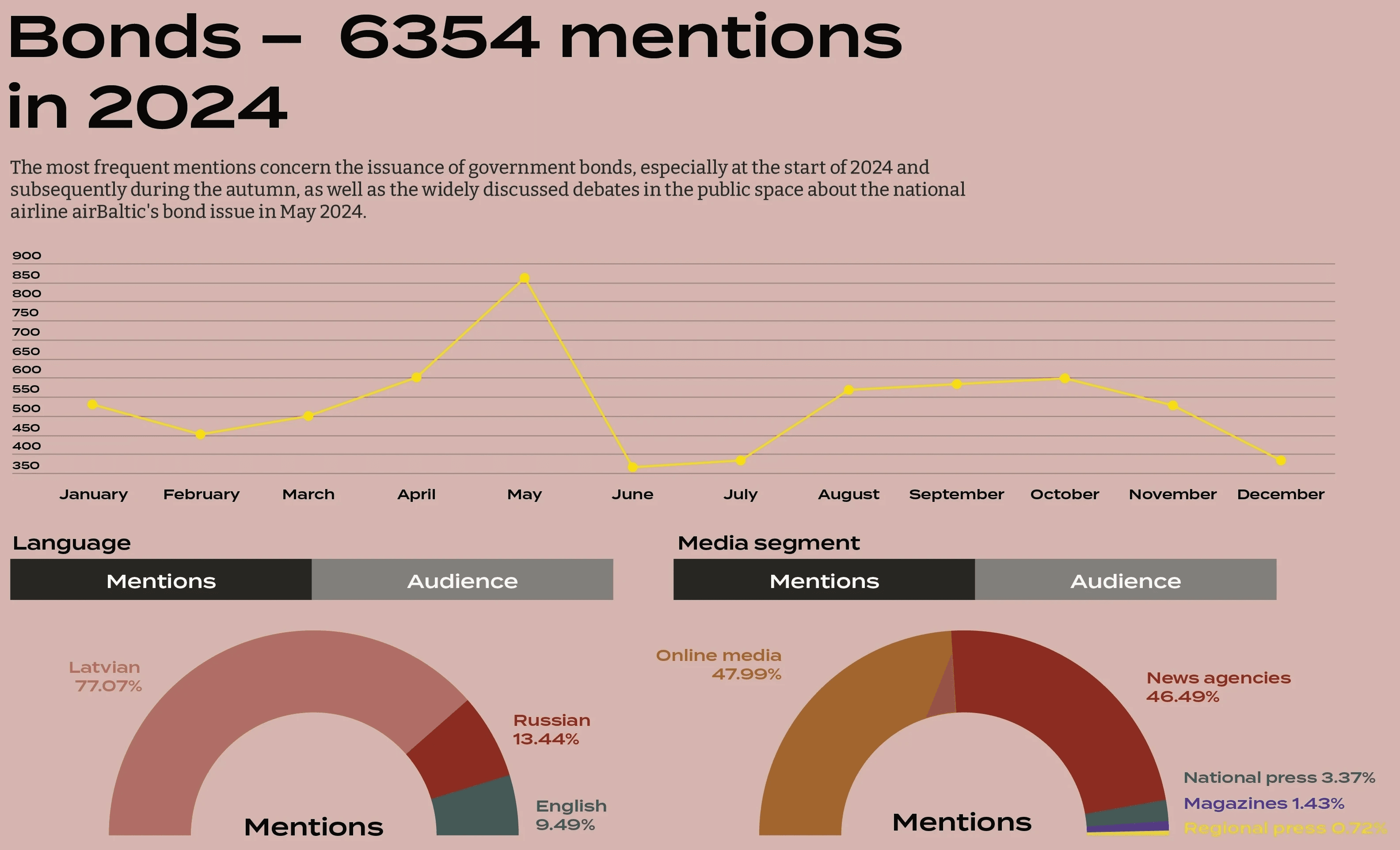 Of all the topic blocks analysed, bonds are mentioned most frequently in the media – from 2021 to 2024, this topic appeared in 18,870 media materials, with almost a third of them (6,354 publications) during the past year.