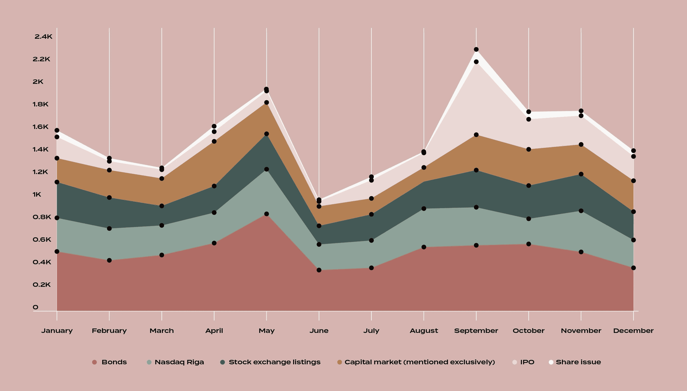 The Barometer analysis covers the period from 2018 to 2024, with a more detailed focus on 2024. To assess the coverage of the capital market in the public space, print and internet portal materials were analysed using keywords in the following groups: capital market, bonds, Nasdaq Riga, stock exchange listing, IPO, share issue.