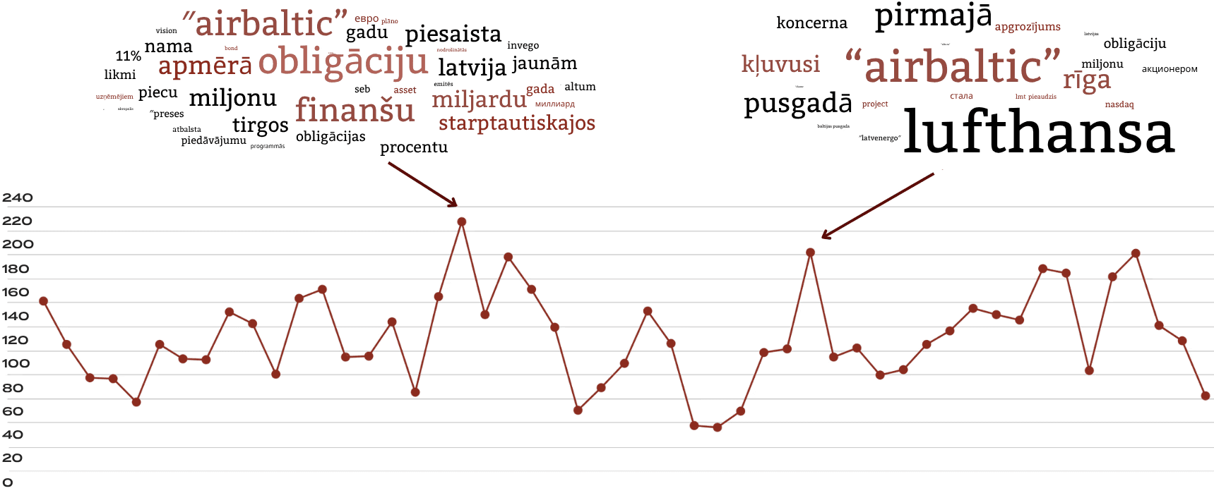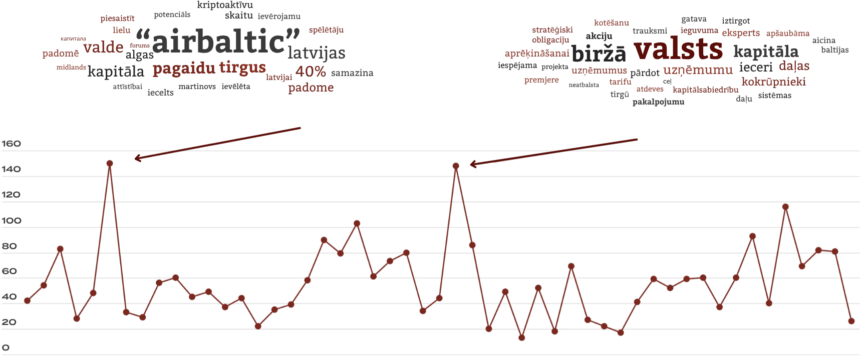 Akciju emisija medijos pieminēta 624 reizes, savukārt nākamais bloks – IPO jeb sākotnējā akciju kotācija biržā – 3 677 publikācijās. Šis fakts ir īpaši interesants tādēļ, ka divas trešdaļas pieminējumu veido viens uzņēmums – “airBaltic”. Aizvadītais gads šim uzņēmumam ir bijis, aviācijas terminoloģijā runājot, turbulencēm bagāts. Un jau šogad, paziņojot pērnā gada rezultātus, tika klusām atzīts tas, ko varēja prognozēt, – iziešana biržā pagaidām tiek atlikta.